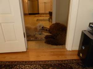 Alice is in love. The object of her affection is Jasper, a hefty Labradoodle who looks more like a bear than a dog. They are both shaggy but otherwise they are a picture of contrasts. She’s a creamy 25 pounder; he’s chocolate and weighs 75 pounds. Every day when we pass Jasper’s house on our walk, if he isn’t home or if I don’t have time to stop, I have a mutiny on my hands. Alice emits a doleful cry and like a stubborn donkey in a cartoon, she puts the brakes on and no amount of cajoling will get her to move. Since I don’t want to drag her little butt along the sidewalk, the only way to keep going is to pick her up and carry her far enough away that she loses his scent. According to Jasper’s owner, Fran, when we have a scheduled play date and she announces it to Jasper, he posts himself at their front window and waits.