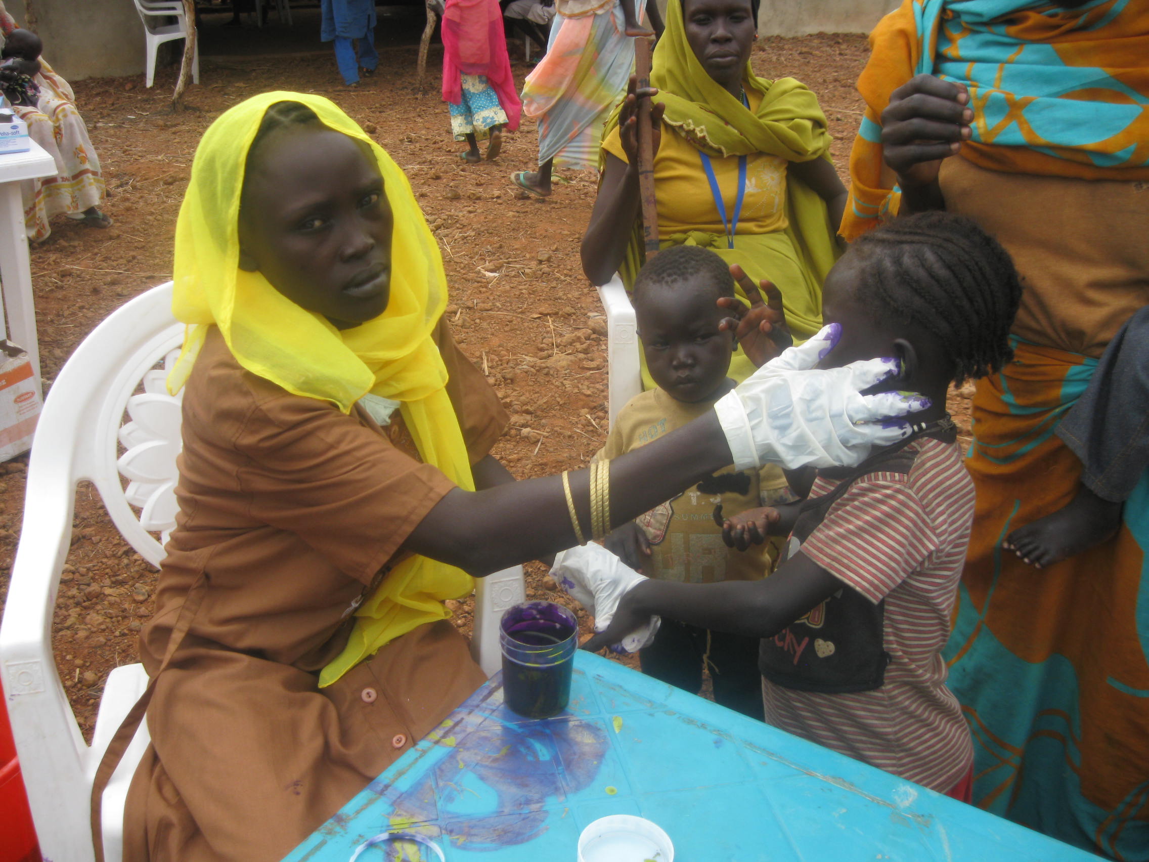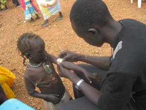 in order to make sure no kids get screened twice (or come back for a second ration of plumpy doz) we dip their pinkies in this purple stuff called gentian violet that’s used to protect wounds that also stains their skin for a week. after they dip their pinkie we smear it on their left earlobe. this way on day 2 and after we can check all the kiddos for purple ears to make sure they’re not repeat customers