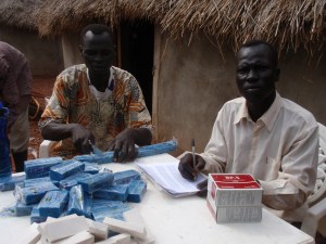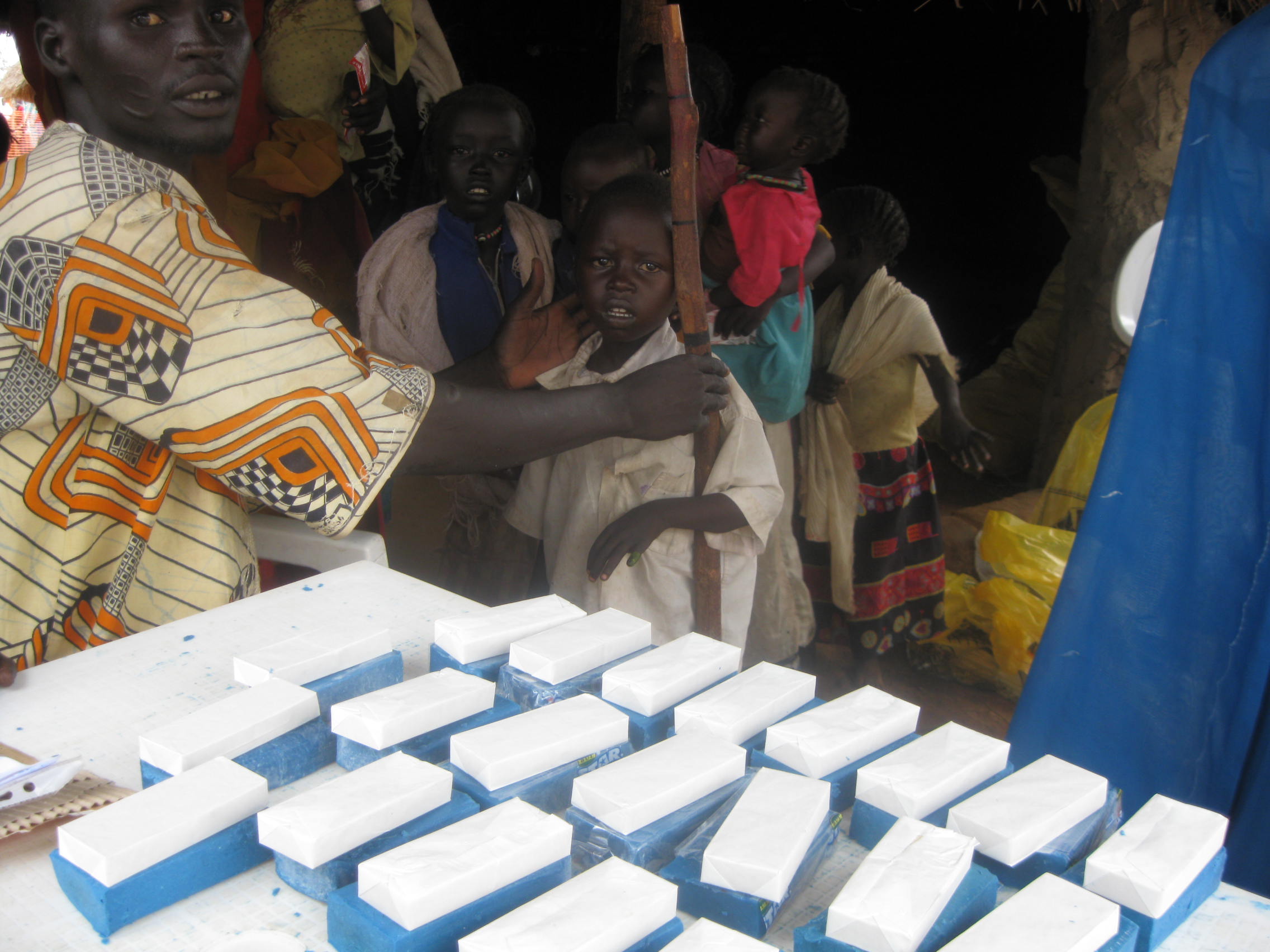 for all the kids who were either too big or too small for the Plumpy Doz distritbution we gave them a BP-5 (high calorie biscuit bar full of vitamins) and a bar of soap. you can see my outreach worker Benjamin measuring a too big boy here.