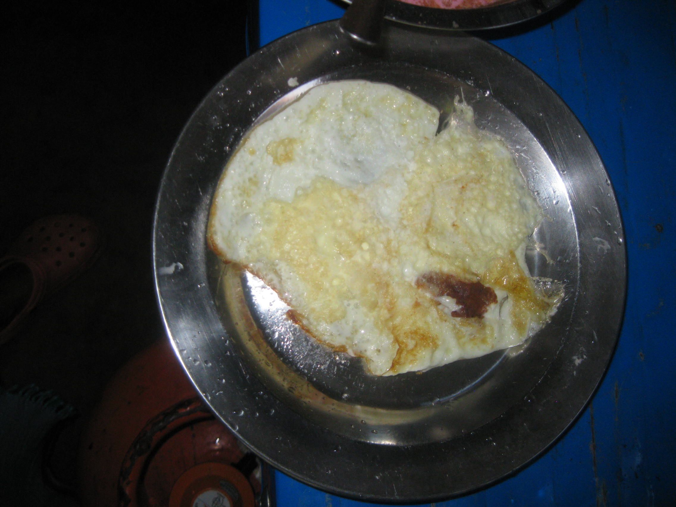 creative! fried eggs with a tiny scoop of precious red curry to savor intermittently