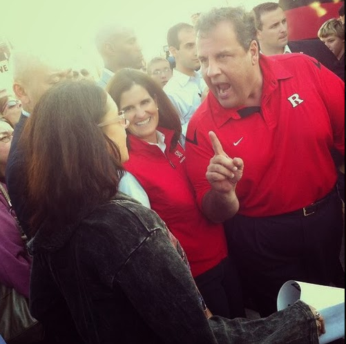 Christie has consistently bashed teacher’s unions and at a Rutgers football rally a kindergarten teacher approached him to ask: “Why do you portray New Jersey Public Schools as ‘failure factories?'” Christie responded that he was sick of “you people” but the photo of Christie face is more telling than his words. (Even more arresting is the undecipherable smile on wife Mary Pat’s face as she witnessed his take down of the teacher.)